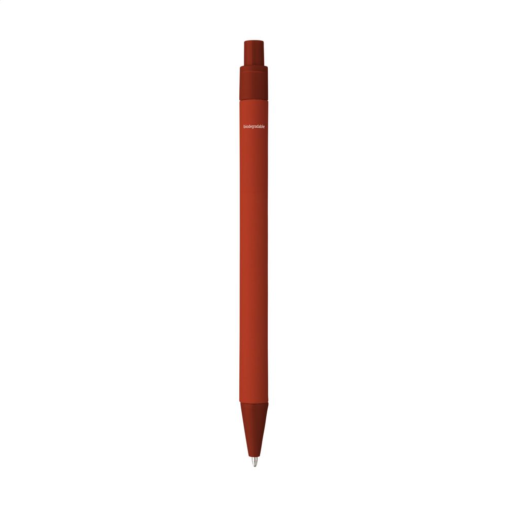 Blauwchreibender Kugelschreiber mit Halter aus Recyclingpapier. Der Clip, der Druckknopf und die Spitze bestehen aus biologisch abbaubarem PLA.