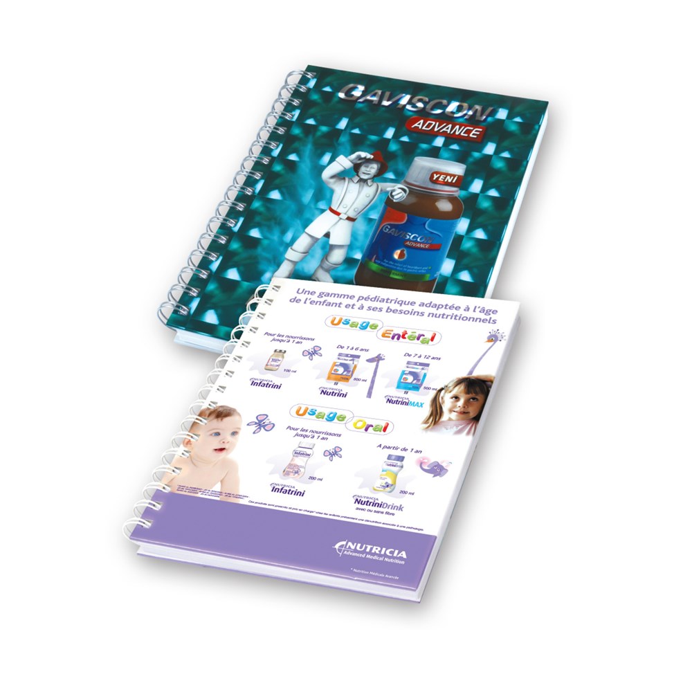 Hardcover 15x21 cm - 4/0c CMYK mit Spiralbinding - in einer unserer Standardfarben 50 Blatt - Papier in weiß - 80 gr - 1/1c einzeln mit Papierbanderole verschlossen