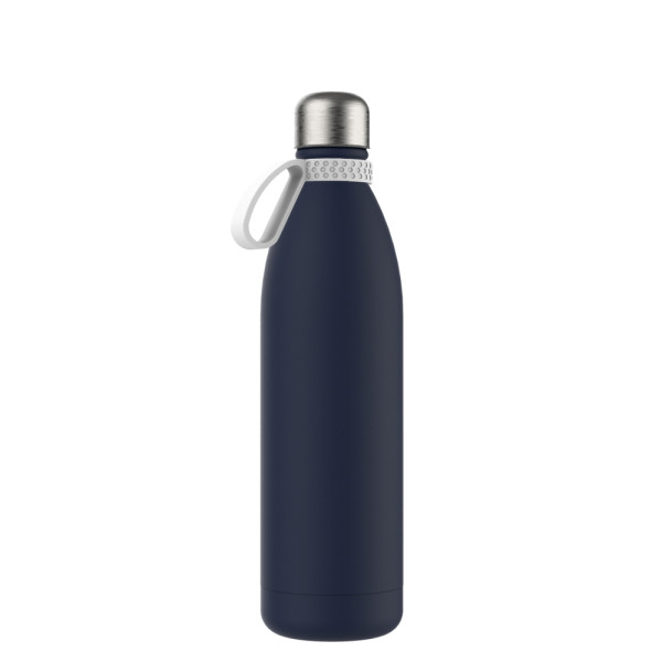Die doppelwandige Thermo Trinkflasche fasst 750 ml und ist somit die größere Alternative zu unserem ursprünglichen Modell. Sie hält Ihre Getränke zuverlässig heiß oder kalt und besticht durch ihre besonders große, prominente Logofläche. Sie ist entweder mit navy-blauer, schwarzer oder weißer Pulverbeschichtung oder in Edelstahl matt silber mit Antifingerprint-Beschichtung erhältlich. Der Drehverschluss schützt vor dem Auslaufen.