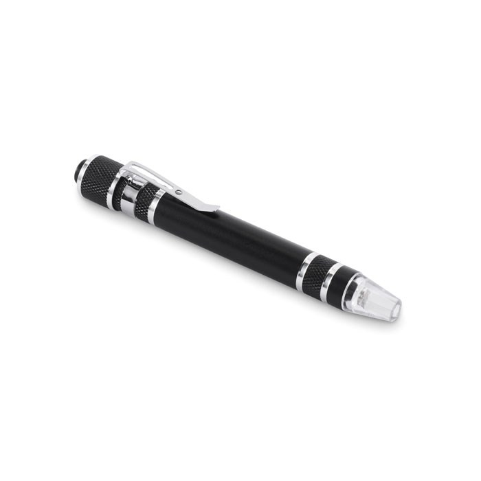 Multitool in Form eines Stiftes aus recyceltem Aluminium. Inkl. 3 Schlitz- und 3 Phillips-Schraubendreherköpfen und Taschenlampe. Inkl. 4 Knopfzellen LR41.
