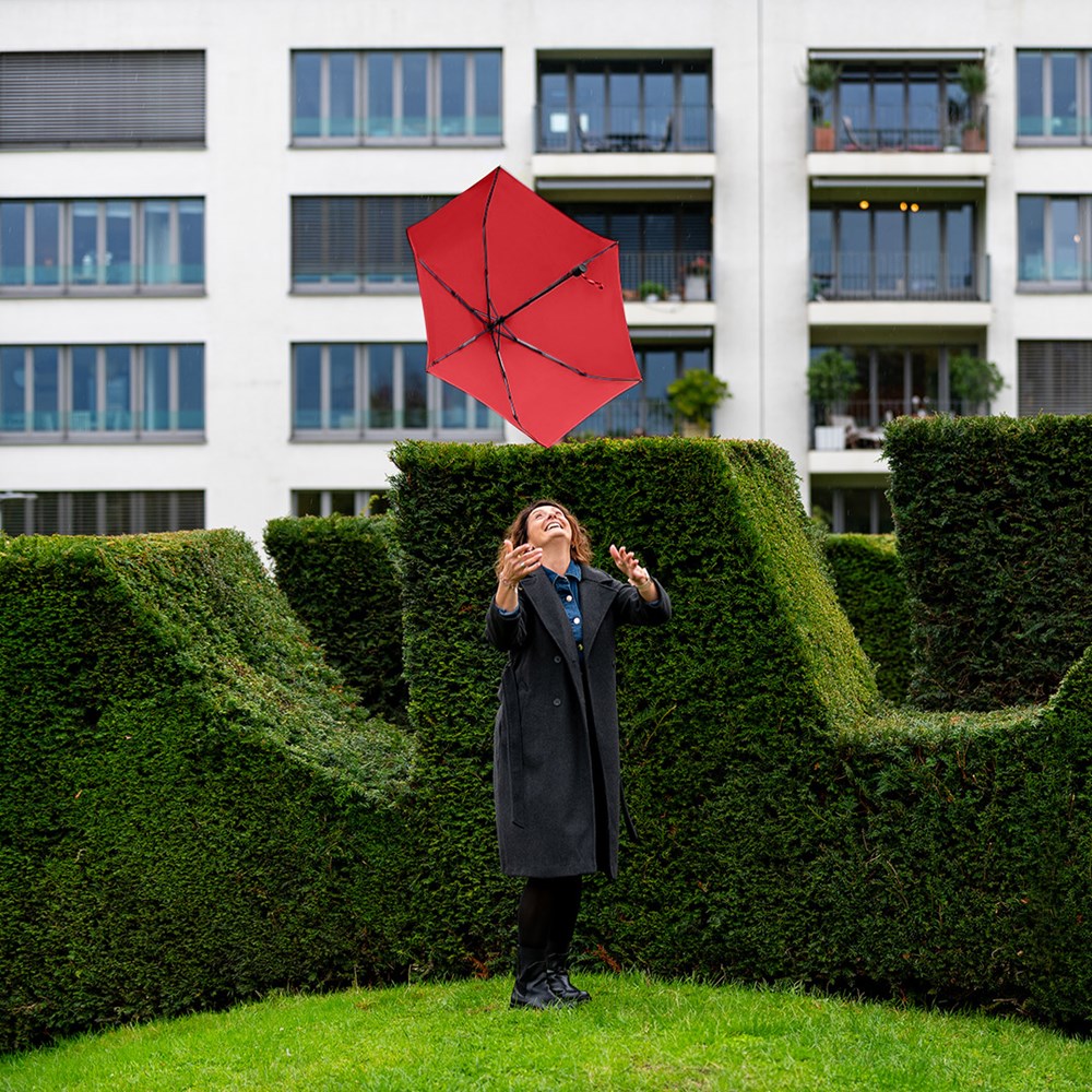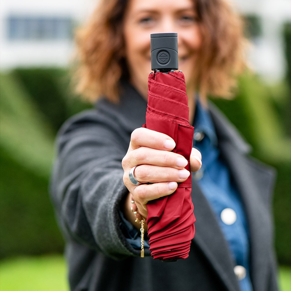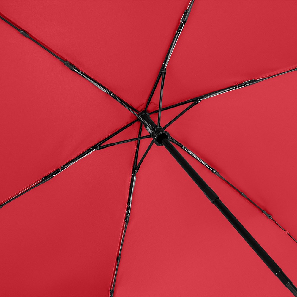 Filigraner Doppelautomatik-Taschenschirm in superleichter Ausführung Komfortable Automatik-Funktion zum schnellen Öffnen und Schließen, hochwertiges Windproof-PLUS-System für eine maximale Gestell-Flexibilität bei stärkeren Windböen, schwarzer Aluminiumstock, wassersparend gefärbtes Polyester-Pongee waterSAVE® Bezugsmaterial aus recycelten Kunststoffen, mit waterSAVE®-Label auf dem Schließband, matt-schwarzer Kunststoff-Softfeel-Griff mit Auslösetaste und Werbeanbringungsmöglichkeit, handtaschentauglich durch superleichtes Gewicht und kompakte Größe