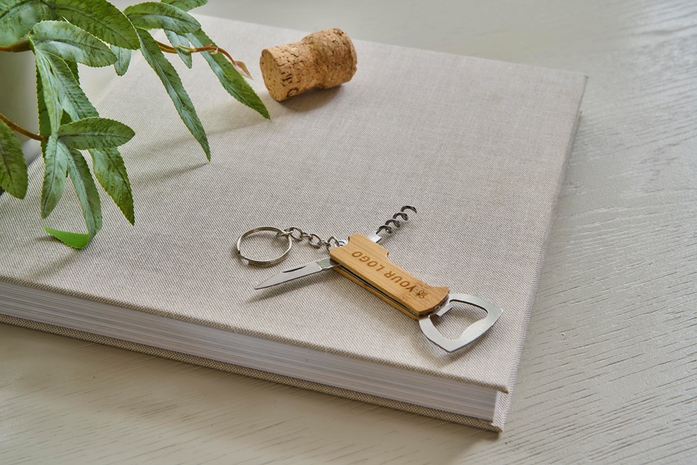 Bambus-Multitool mit 3 Funktionen, einschließlich eines Schlüsselrings aus Metall.Das Multitool beinhaltet einen Flaschenöffner, ein Taschenmesser und einen Korkenzieher. Einzeln verpackt in einer braunen Pappschachtel.
