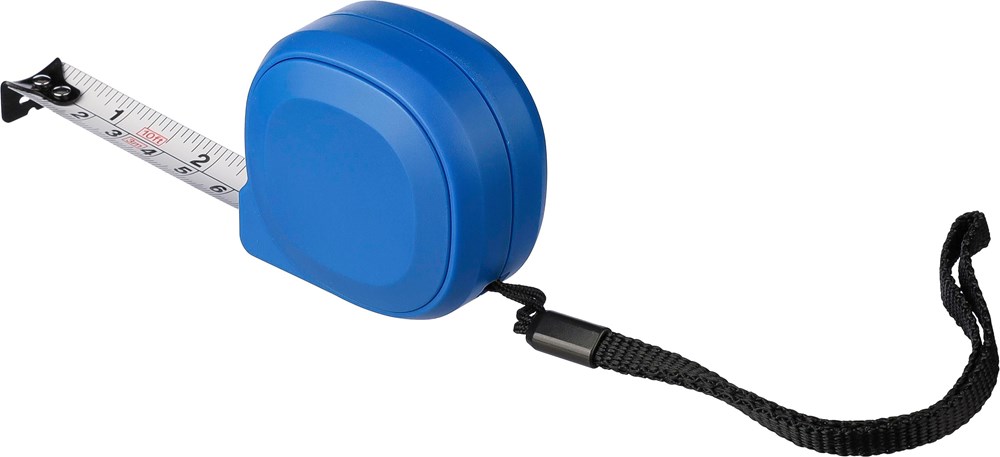 ABS-Maßband mit einem Polyester-Armband. 3 Meter in der Länge. Band aus Metall (16 mm), bedruckt mit Zentimetern und Zoll. Inklusive Druckknopf mit Schloss. Einzeln verpackt in einer braunen Pappschachtel.