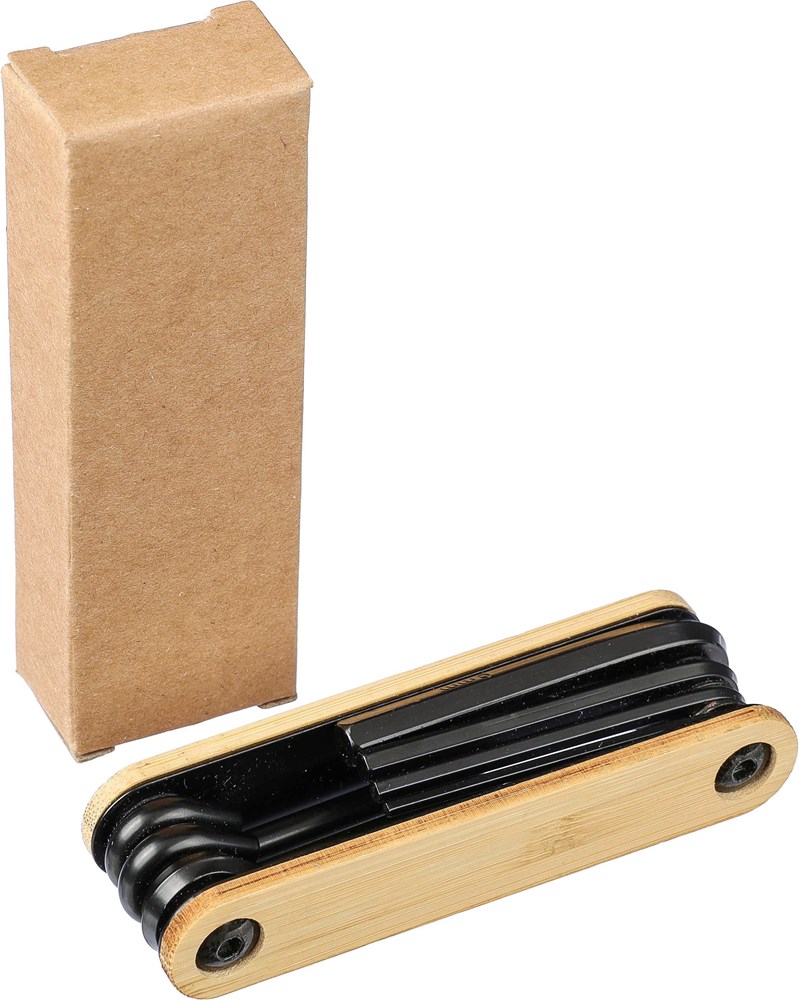 Werkzeugset aus Kohlenstoffstahl mit Bambusdetails. Enthält 7 Werkzeuge: Inbusschlüssel, Kreuzschlitzschraubendreher und Schlitzschraubendreher. Einzeln verpackt in einer braunen Pappschachtel.