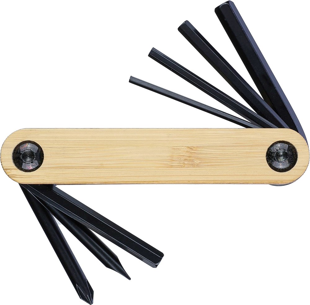 Werkzeugset aus Kohlenstoffstahl mit Bambusdetails. Enthält 7 Werkzeuge: Inbusschlüssel,... mehr