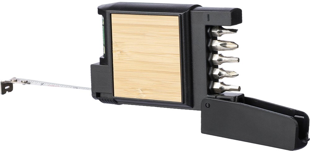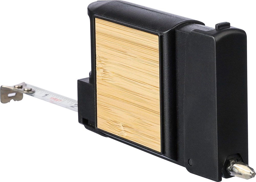 ABS Maßband mit Bambusdetails und Skala. Länge 3 Meter. Enthält 5 Bits zur Verwendung als Schraubendreher. 12 mm Metallsplitter. Einzeln verpackt in braunem Karton.