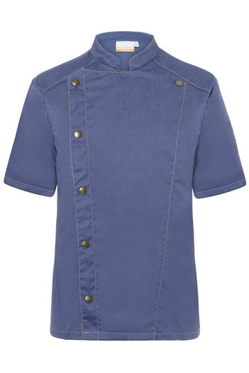 Kochjacke in Jeans-Optik mit schlanker Silhouette und kurzen Ärmeln | Kontrastfarbige Steppnähte | Asymmetrisch geschlossene, einreihige 5-Knopf-Jacke mit Druckknöpfen | Aufgesetzte linksseitige Ärmeltasche (11 x 13 cm) mit praktischem Stiftfach (2 x 13 cm) | Industriewäschetauglich | Hochveredelt, einlaufvorbehandelt, waschecht, pflegeleicht