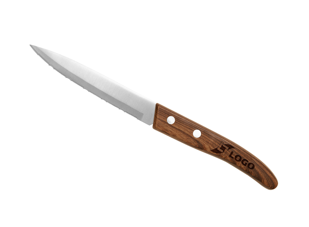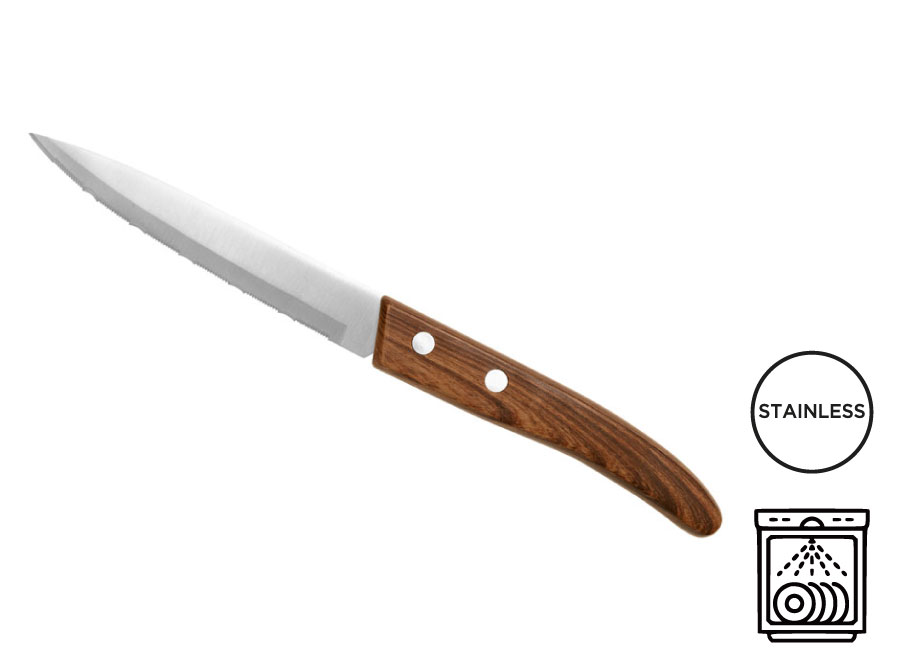 10 cm lange Klinge aus rostfreiem Edelstahl 13/0 für den Lebensmittelgebrauch mit Hochglanzfinish. Mikrozahnung. Griff aus ABS mit Holzoptik. Spülmaschinengeeignet.