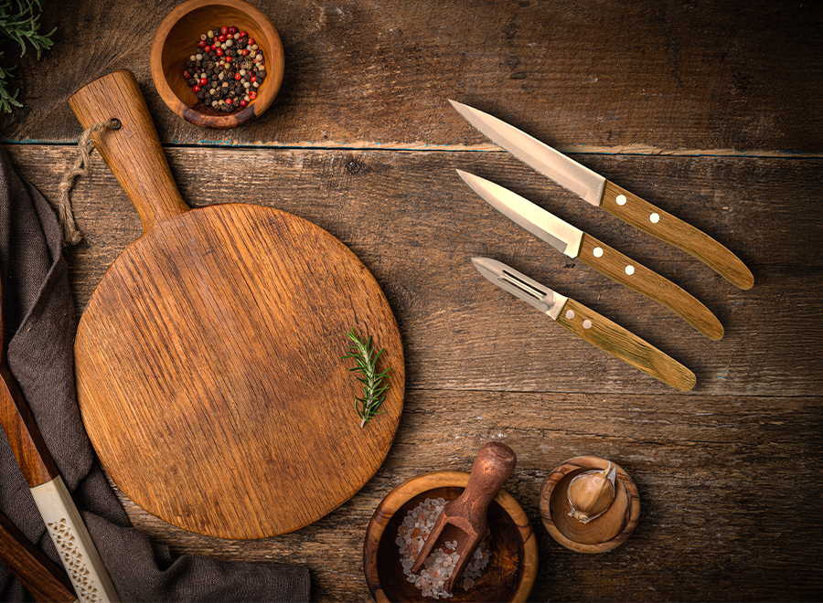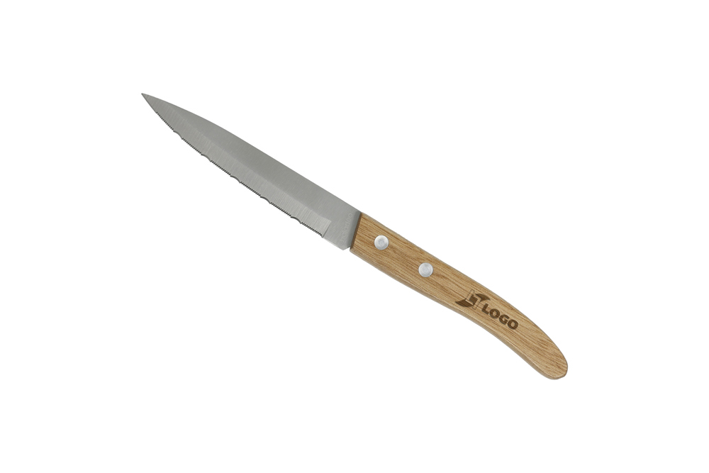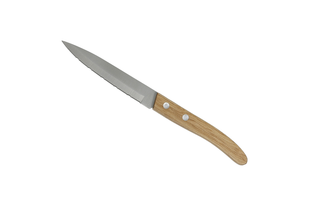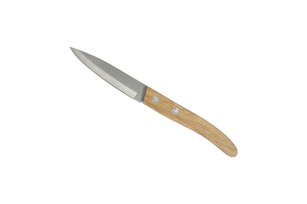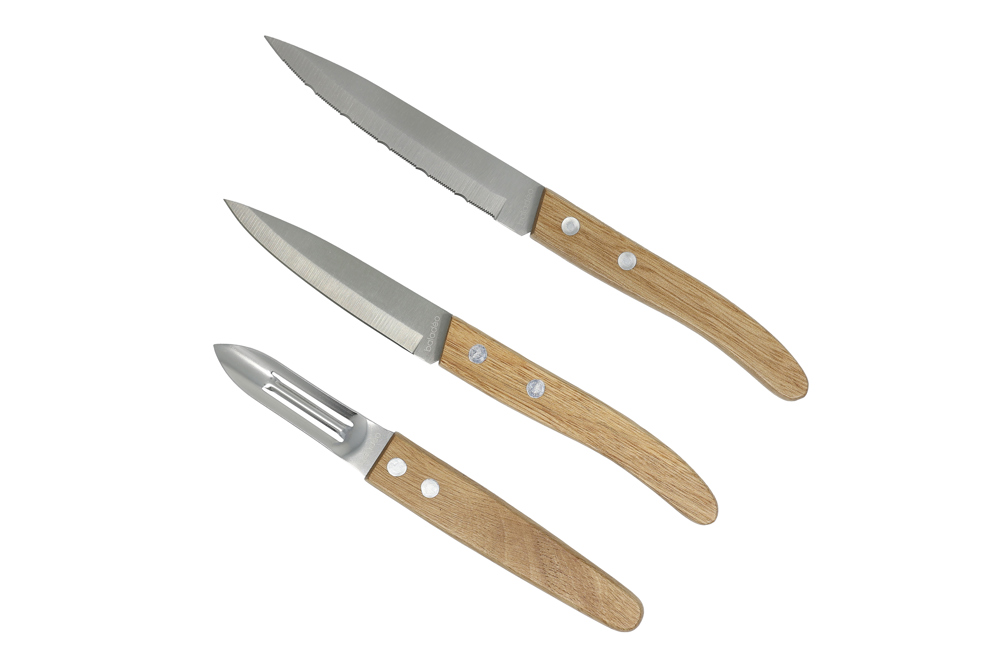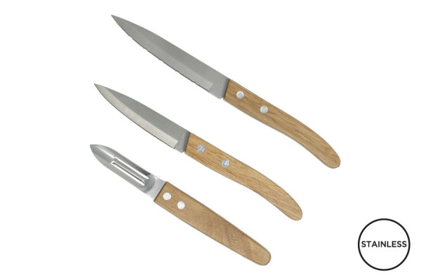 Klingen aus rostfreiem Edelstahl 13/0 mit satinierter Oberfläche. Geeignet für Lebensmittel . Ein Schälmesser (Klinge 8 cm), ein Tomatenmesser (Klinge 10 cm mit Mikroverzahnung) und ein Schäler. Massivholzgriffe.