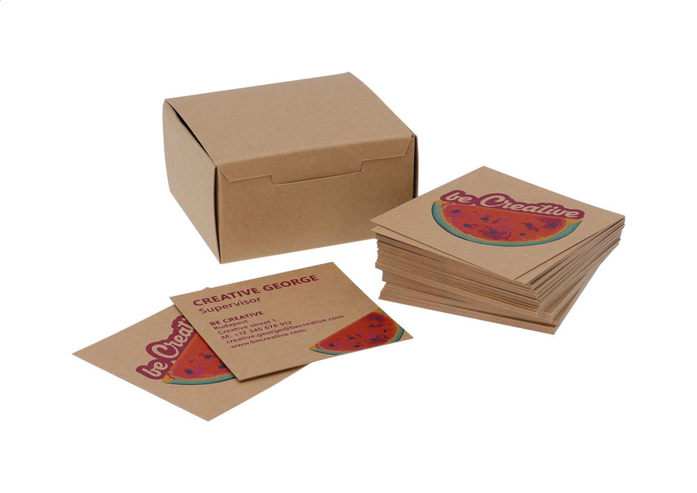 100 Stück maßgefertigte, quadratische Visitenkarten mit beidseitigem Vollfarbdruck. Mattes Kraftpapier, 300 g/m². In Kraftpapierbox.