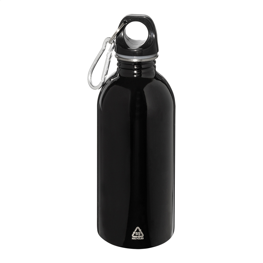 Recycelte Edelstahlflasche mit Aluminiumkarabiner. Füllmenge: 400 ml.