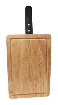 Material: Schneidebrett Gummiholz, Messer Kunstoff und Edelstahl