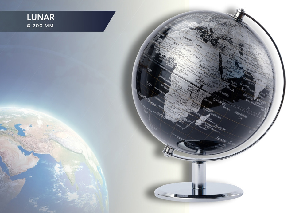 Globus mit 20 cm Durchmesser, verchromter Metallfuß, bewegliche Achse, Kunststoff, Metall, glänzend, schwarz/silberfarben