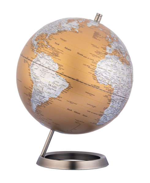 Globus mit 25 cm Durchmesser, verchromter Metallfuß in gebürsteter Optik, 23,5 Grad Neigung an beweglicher Achse, Kartenrelief, Kunststoff, Metall, matt, bronzefarben/silberfarben