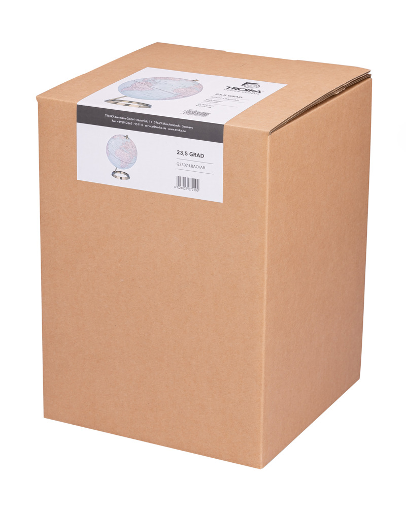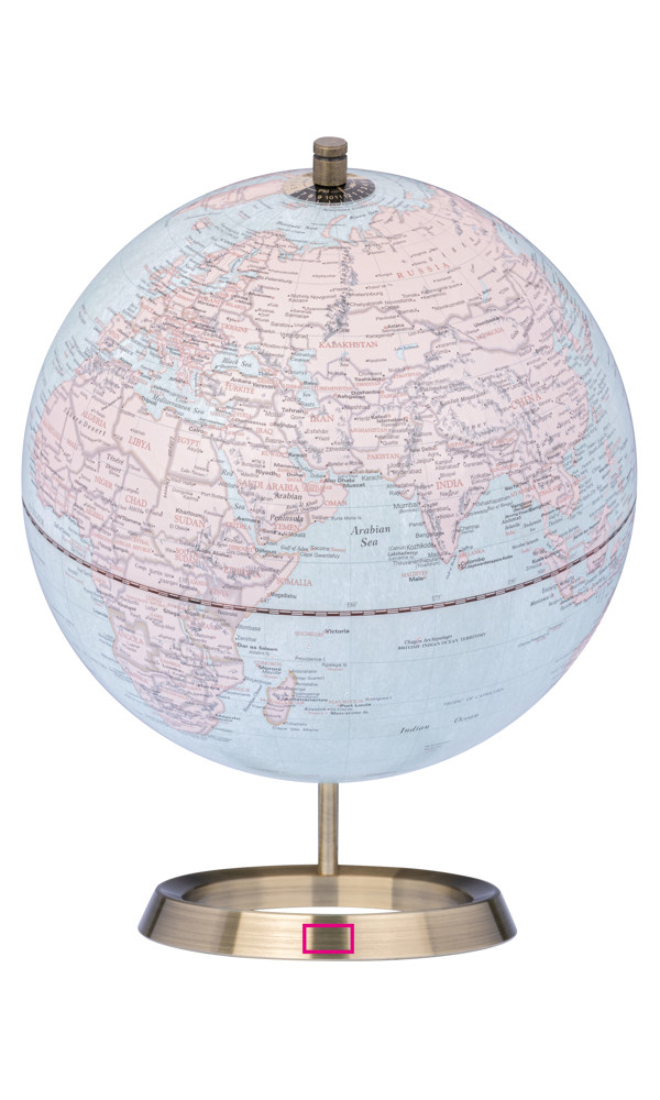 Globus mit 25 cm Durchmesser, verchromter Metallfuß in gebürsteter Optik, 23,5 Grad Neigung an beweglicher Achse, Kartenrelief, Kunststoff, Metall, matt, beige/hellblau