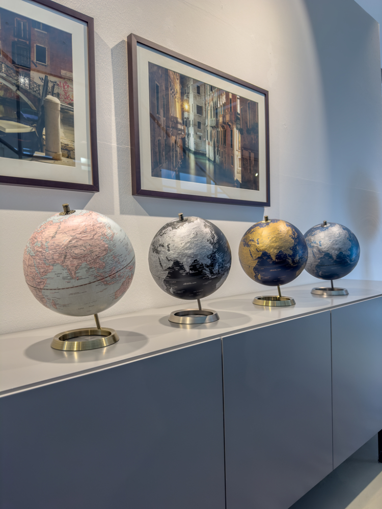 Globus mit 25 cm Durchmesser, verchromter Metallfuß in gebürsteter Optik, 23,5 Grad Neigung an beweglicher Achse, Kartenrelief, Kunststoff, Metall, matt, blau/silberfarben