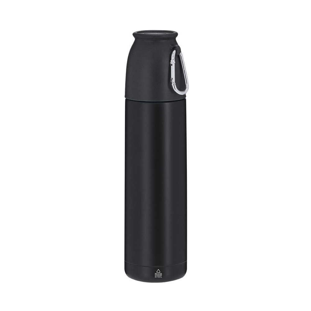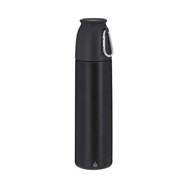 Set aus Thermoskanne und Becher, hergestellt aus recyceltem Edelstahl. Thermoskanne mit einer Kapazität von 500 ml und doppelter Wand, die eine bessere und dauerhafte Temperaturerhaltung garantiert, mit Sicherheitsspender. Becher mit 120 ml, verstellbar durch Schraubverschluss und mit praktischem Transportkarabiner. Thermoskanne und Becher im matten Finish, ideal für den Genuss von Getränken, ob heiß oder kalt, jederzeit und überall. Mit dem Markenzeichen von recyceltem Edelstahl.Edelstahl ist eines der gefragtesten Materialien und kann fast überall gefunden werden, von Alltagsprodukten bis hin zu großen Konstruktionen. Mit unzähligen Eigenschaften, darunter Haltbarkeit und ein hohes Maß an Wiederverwendbarkeit, macht es zu einer geschätzten Alternative in nachhaltigen Lösungen. Richtig behandelt, ermöglicht es die Gewinnung neuer Ressourcen mit unendlichen Nutzungsmöglichkeiten.