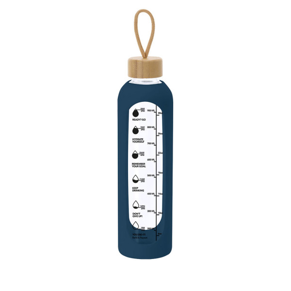Flasche aus 1L Glas, entworfen, um eine angemessene Hydration zu fördern. Mit einer Silikonhülle, die schützt und einen bequemen und sicheren Halt bietet.Inklusive Kapazitätsanzeige in Litern und Unzen, begleitet von motivierenden Sätzen, die dazu inspirieren, eine angemessene Hydration täglich aufrechtzuerhalten. Der Deckel, aus Bambus gefertigt, hat eine praktische Kordel für einfachen Transport. BPA-frei.