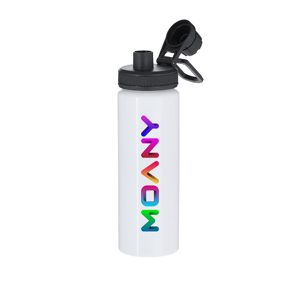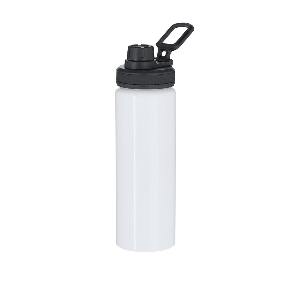 Aluminiumkanister mit einem Fassungsvermögen von 800 ml. In glänzendem Weiß, speziell entworfen für Sublimationsdruck. Enthält einen schwarzen Deckel mit Schraubverschluss, grau Silikon-Griff für optimale Versiegelung, Dosierer und verstellbaren Tragegriff. BPA-frei.