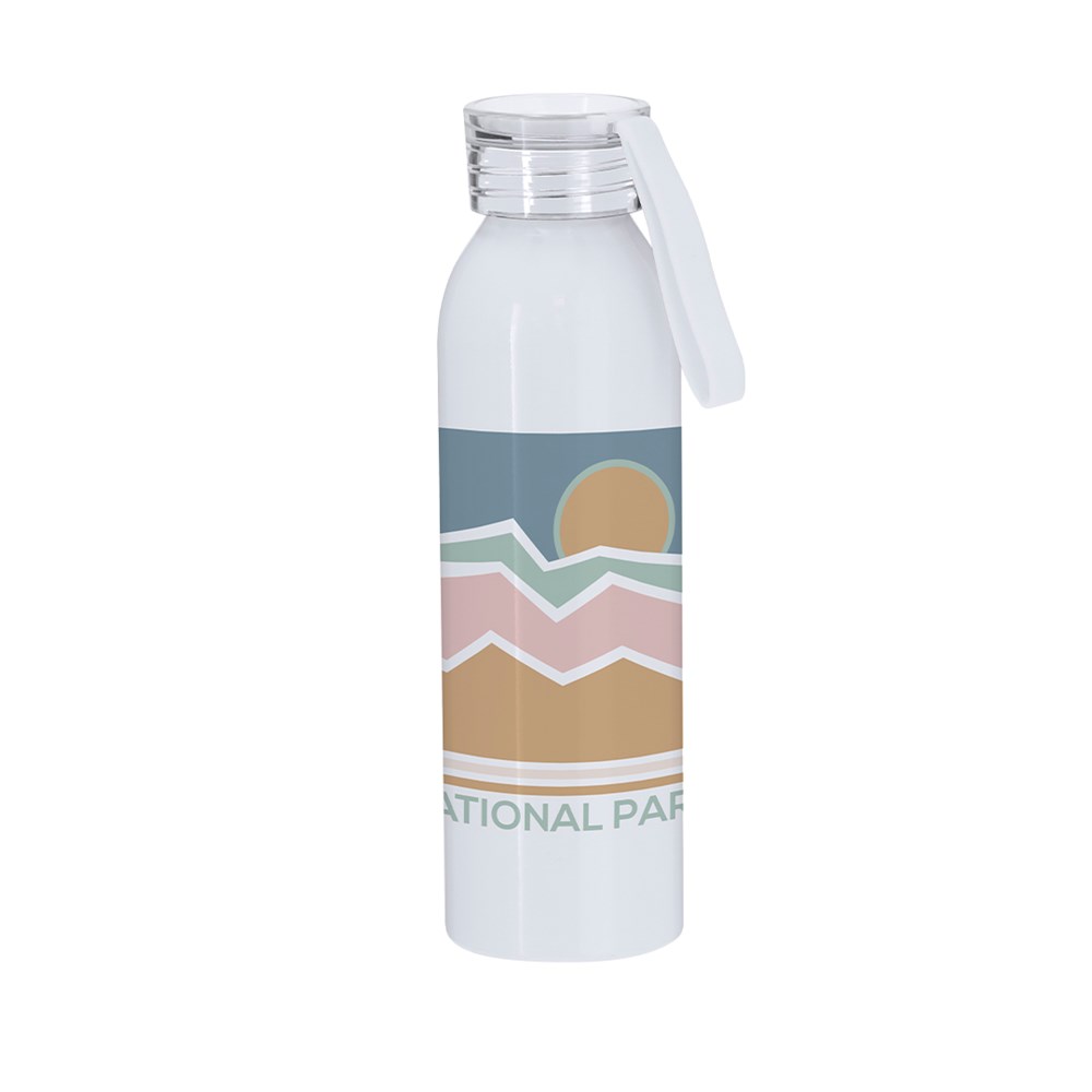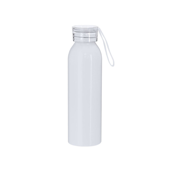 Kanister mit 650 ml Fassungsvermögen, aus robustem Aluminium. In glänzendem Weiß, speziell für Sublimationsdruck konzipiert. Mit transluzidem Schraubverschluss und passendem Tragegurt für einfachen Transport. BPA-frei.