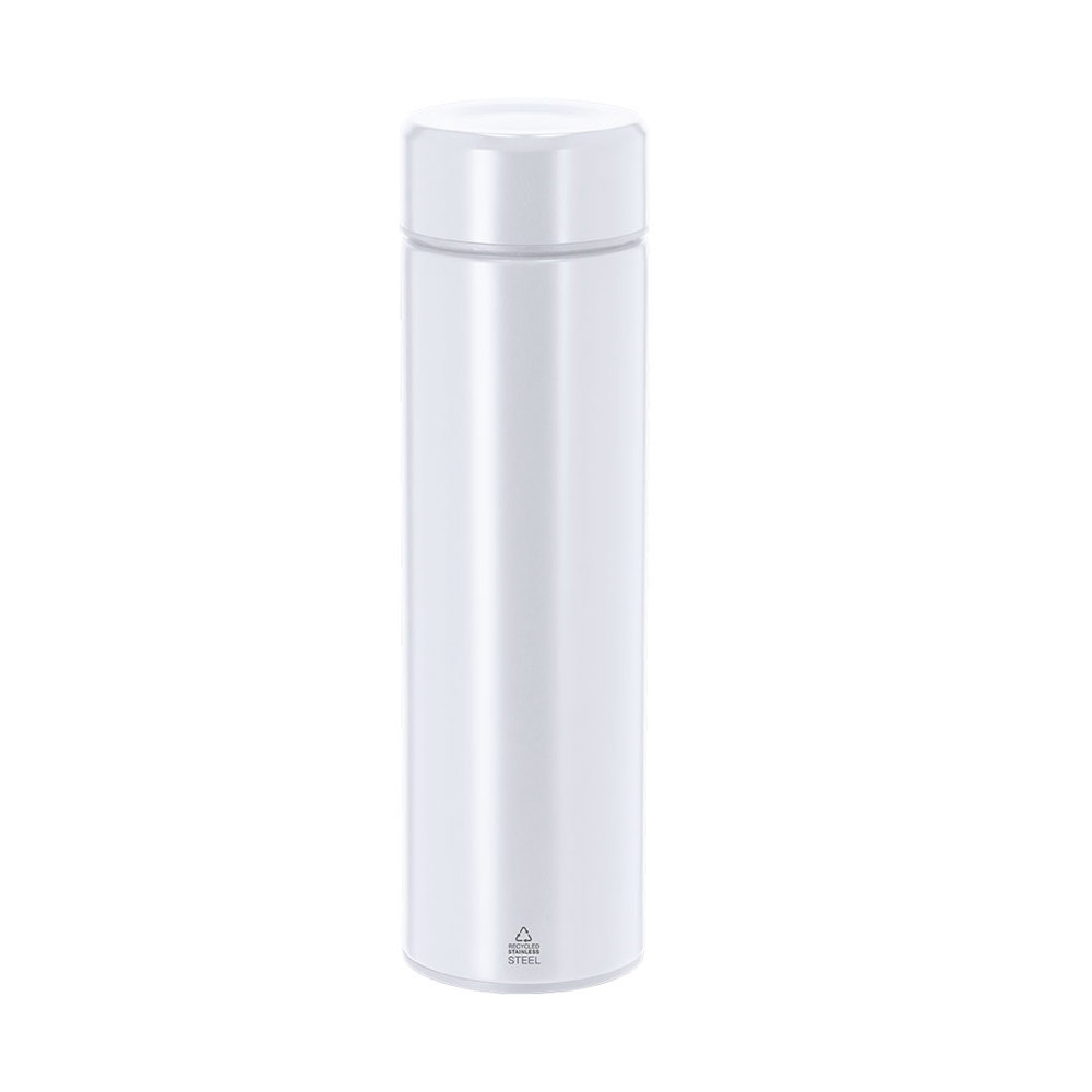 Thermosflasche aus recyceltem Edelstahl mit einem Fassungsvermögen von 450 ml. Mit doppelter Wand für bessere und langlebigere Temperaturkonservierung und Innenbeschichtung aus Keramik, geeignet für kohlensäurehaltige Getränke. Infuser inklusive und einfach zu öffnendes Schraubsystem. Mit Kennzeichnung für recycelten Edelstahl.Edelstahl ist eines der gefragtesten Materialien und kann fast überall gefunden werden, von Alltagsprodukten bis hin zu großen Konstruktionen. Mit unzähligen Eigenschaften, darunter Haltbarkeit und hohe Wiederverwendbarkeit, ist es eine sehr geschätzte Alternative in Nachhaltigkeitslösungen. Richtig verarbeitet, ermöglicht es die Gewinnung neuer Ressourcen von unendlicher Nutzung.