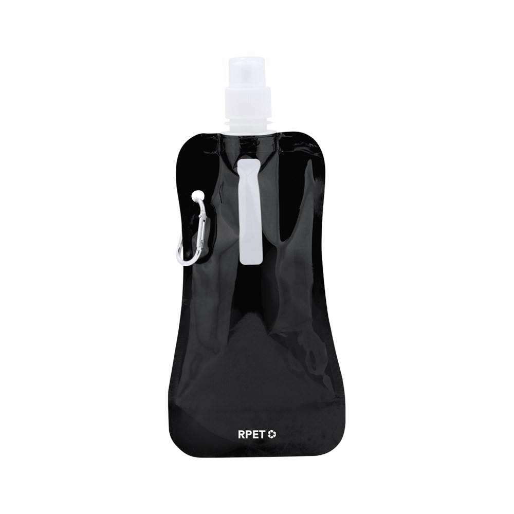 Flaschenbehälter mit 400 ml Kapazität, flexibler Körper aus RPET. Mit Sicherheitsverschluss und metallic Karabinerhaken für den Transport.Das RPET-Material wird aus recyceltem Kunststoff hergestellt, um die Wiederverwendung von Kunststoffabfällen zu fördern und zur Nachhaltigkeit des Planeten beizutragen.