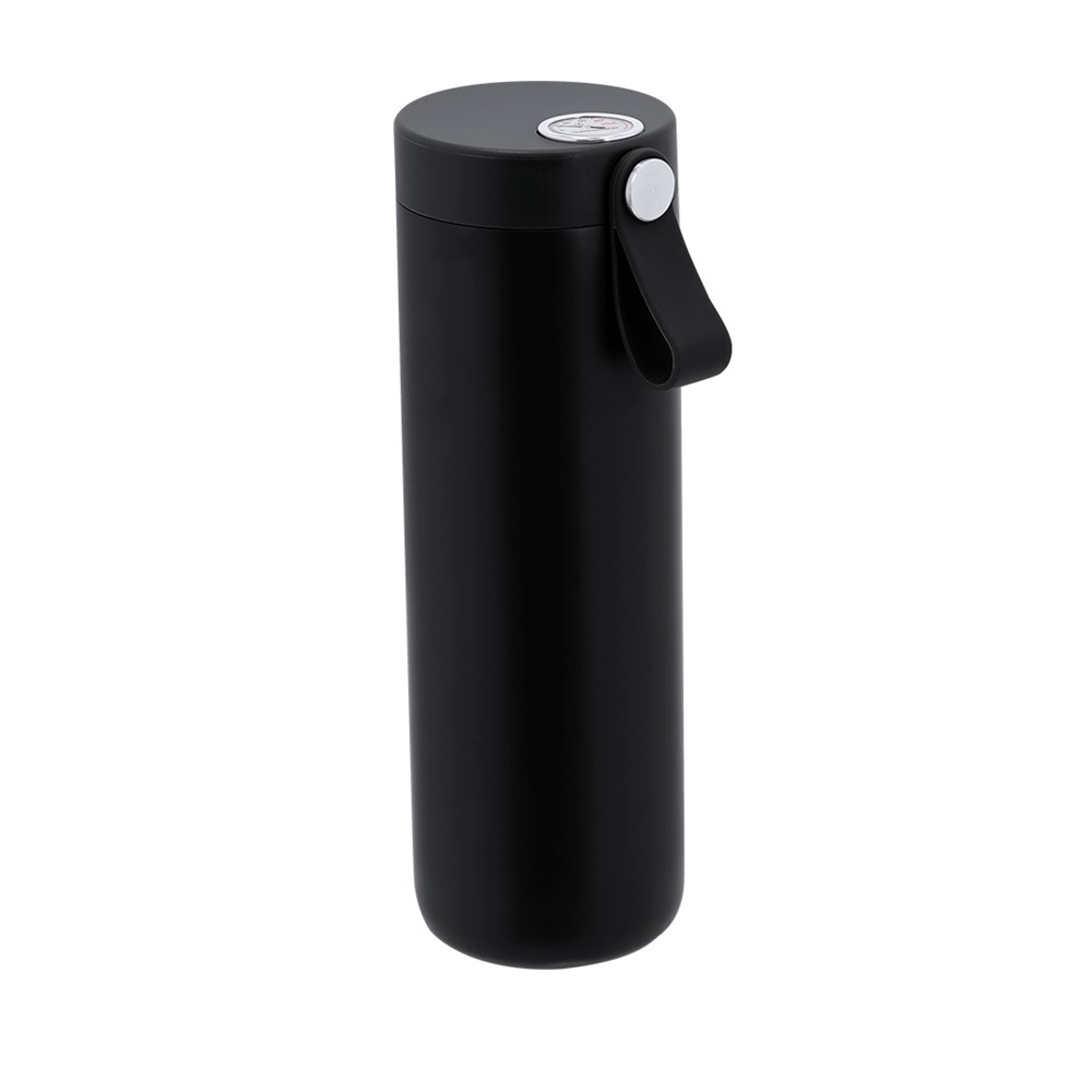 Thermobecher aus Edelstahl mit doppelter Wand und einer Kapazität von 500 ml mit analogem Temperaturmessgerät im Bereich von 0º bis 100º. Mit Sicherheitsverschluss, integriertem Silikon-Griff und passendem Gehäuse. BPA-frei.