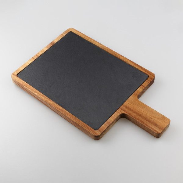 Die Servierplatte Snackboard vereint natürliche Materialien mit funktionalem Design. Die Kombination aus warmem Akazienholz und einer eingelassenen Naturschieferplatte sorgt für einen eleganten, hochwertigen Look und macht das Servierbrett zu einem stilvollen Begleiter für Küche, Tisch und Präsentationen. Die Schieferplatte ist kratzfest, stoßbeständig und lebensmittelecht und eignet sich ideal zum Anrichten von Käse, Obst, Snacks oder Antipasti. Dank des stabilen Griffs liegt das Snackboard sicher in der Hand und lässt sich komfortabel servieren. Eine großzügige Fläche für Logo-Gravuren auf der Schieferplatte macht das Snackboard zu einem hochwertigen Marken- und Genusspräsent für Kunden, Mitarbeitende oder Events. Natürlich, langlebig und vielseitig einsetzbar.