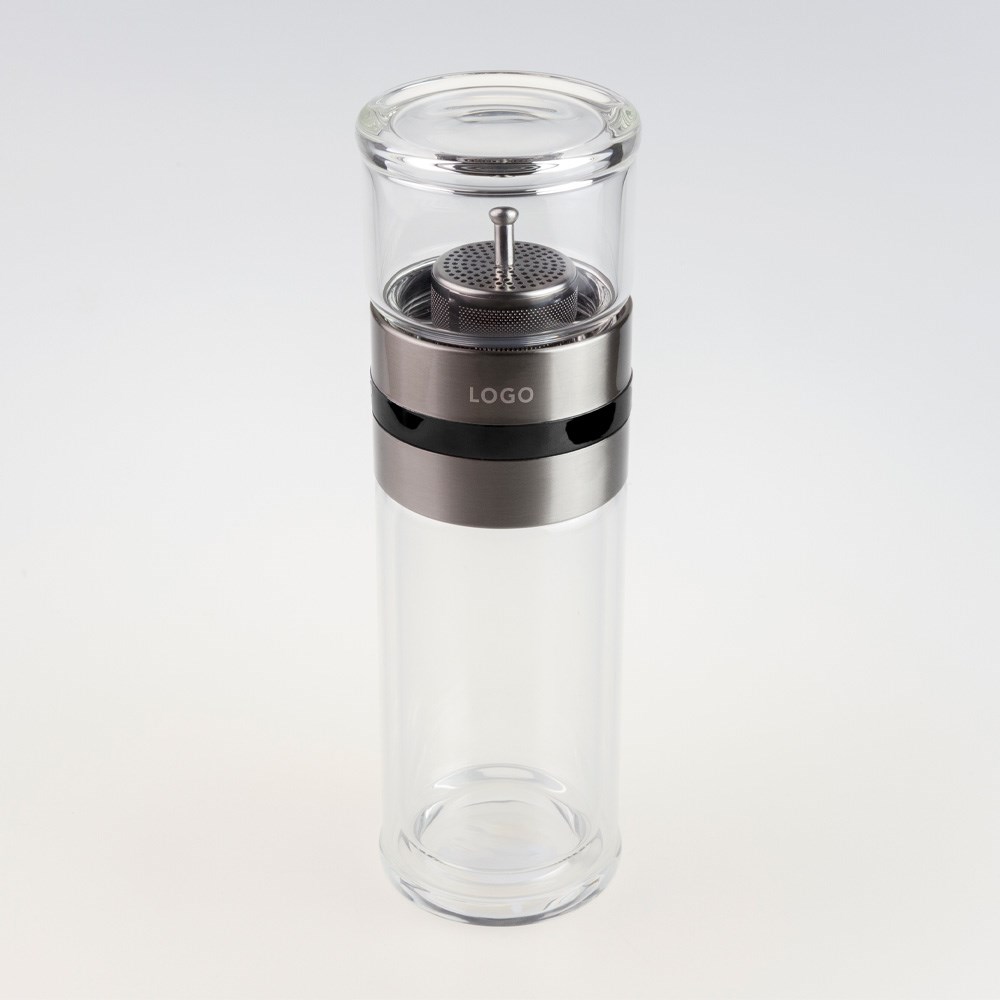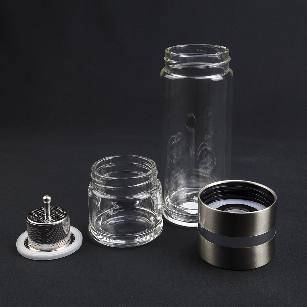 Doppelwandiger Glas-Infuser für heiße und kalte Getränke. Innovativer Aufbau mit Edelstahlfilter für Tee, Beeren oder Kräuter. Hält Getränke warm oder kühl. Aromaintensität durch Drehen regulierbar. Personalisierbar mit Logo-Gravur auf dem Edelstahlring. Füllmenge ca. 300 ml.
