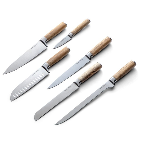 Die ultimative Packung Küchenmesser! Ein komplettes Paket mit hochwertigen Messern. Schön als Einrichtungsdetail in der Küche und perfekt zum Verschenken an die Person, die schon alles hat. Enthält: Küchenmesser, Muschelmesser, Filetiermesser, Santo-Messer, Brotmesser, Fischfiletiermesser in feinstem Design mit Akazienholzgriffen.