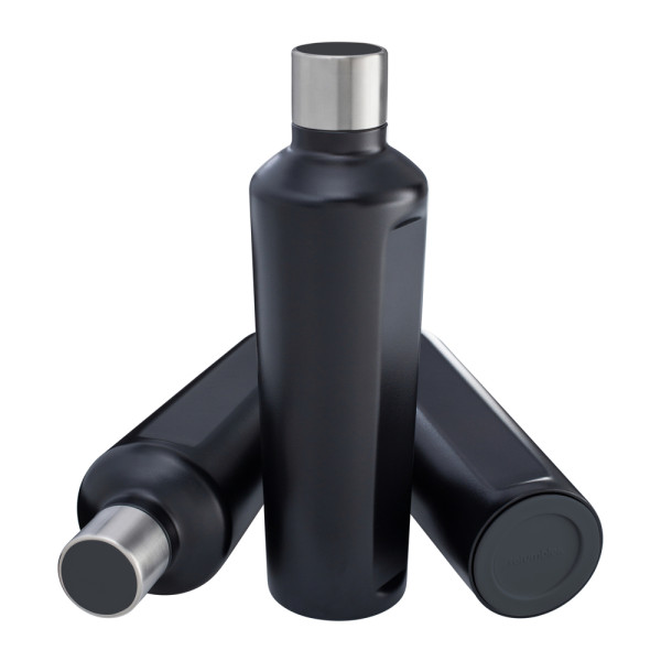 Ein echter Hingucker: Die doppelwandige Thermotrinkflasche mit Vakuum-Isolierung kann mit einem farbigen TPR-Boden und Deckelakzent aus Silikon kombiniert werden. Viele verschiedene Farben stehen ab Köln zur Auswahl. Die von REFLECTS selbst designte Flasche wird in drei verschiedenen Farben (Schwarz, Weiß, Silber) mit hochwertiger Pulverbeschichtung angeboten.