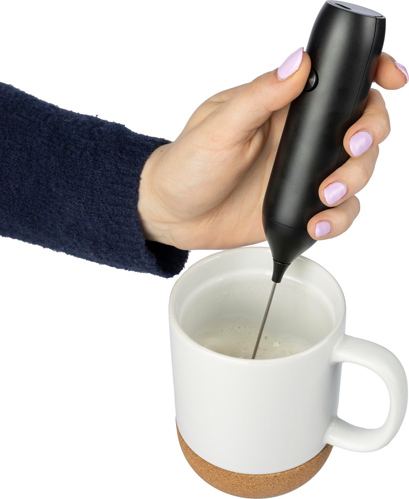 Elektrischer Milchaufschäumer aus ABS mit Edelstahlwerkzeug, 500 mAh Batterie und Ladekabel Typ C (wiederaufladbar). Arbeitet mit einer Rotationsgeschwindigkeit von 10.000 U/min, geeignet zum Aufschäumen von Milch oder Eiweiß. Einzeln verpackt in braunem Karton.