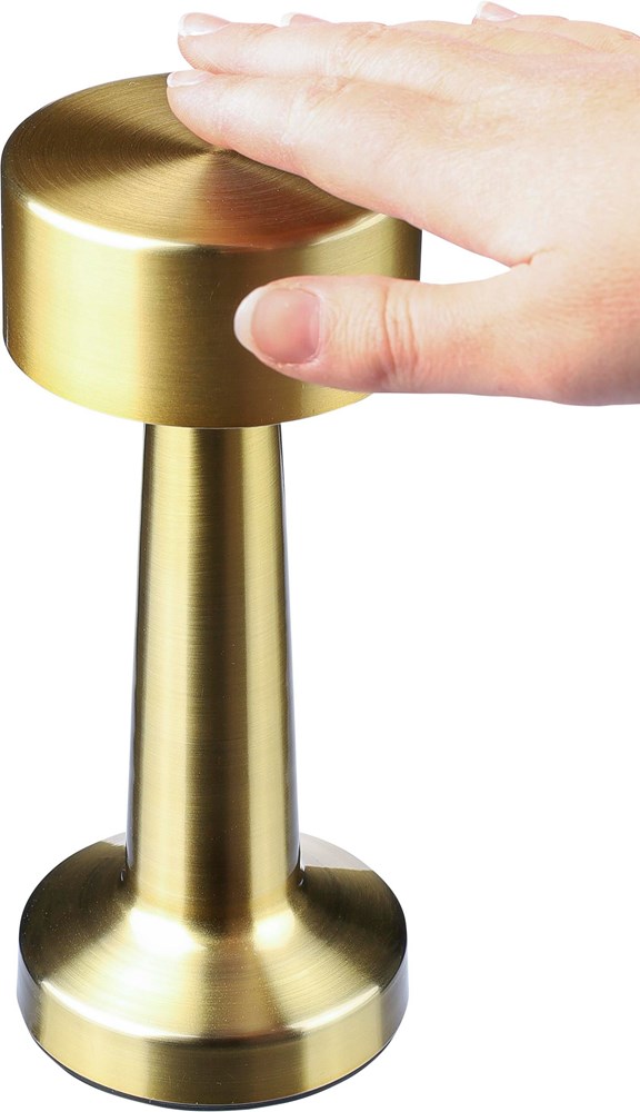 Tischleuchte aus Metall und ABS mit 24 LEDs und drei Lichtmodi (weiß, neutral, warm), die über einen Berührungssensor an der Oberseite gesteuert werden. Inklusive 800 mAh Akku und Ladegerät Typ C mit 1 m Kabel. Die Lampe ist dimmbar und verfügt über einen Ein-/Ausschalter an der Unterseite. Einzeln verpackt in braunem Karton.