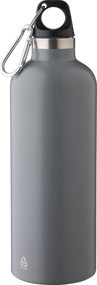 Doppelwandige Flasche aus recyceltem Edelstahl (s/s304) mit einem Fassungsvermögen von 500 ml, PP-Deckel und Aluminium-Karabinerhaken. Hält Getränke 8 Stunden warm und 12 Stunden kalt. Die Flasche hat eine matte Oberfläche (außer Silber) und ist mit einem eingravierten Recycling-Logo versehen. Einzeln verpackt in braunem Karton.