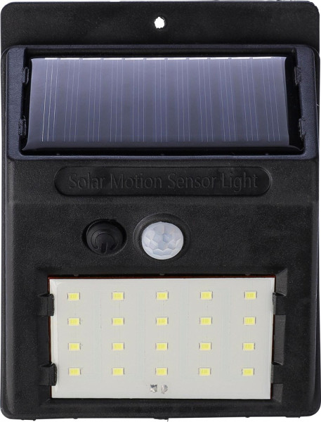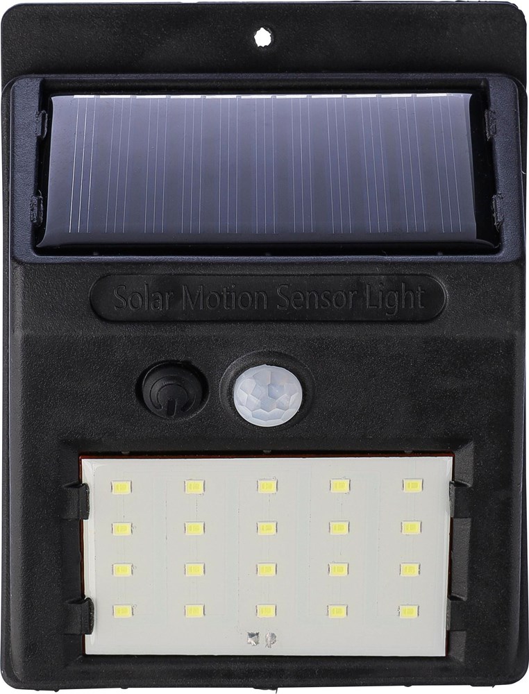 Solarleuchte aus PP mit 20 COB LED. Mit Nachtsensor (CDS) und Bewegungsmelder (PIR). Enthält eine Batterie mit einer Kapazität von 800 mAh, ein Ladekabel, Schutzart IP44 und die Funktionen Dauerlicht und Blinken. Einzeln verpackt in braunem Karton.