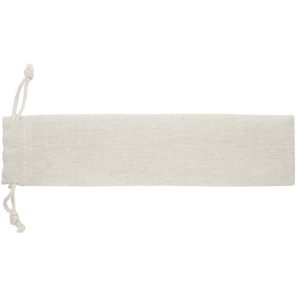 Root-Besteckset mit Gabel, Messer, Löffel, Trinkhalm und Reinigungsbürste. Das Besteck besteht aus langlebigem, leicht zu reinigendem Edelstahl und die Griffe sind aus Buchenholz. Geliefert in einem Baumwollbeutel.
