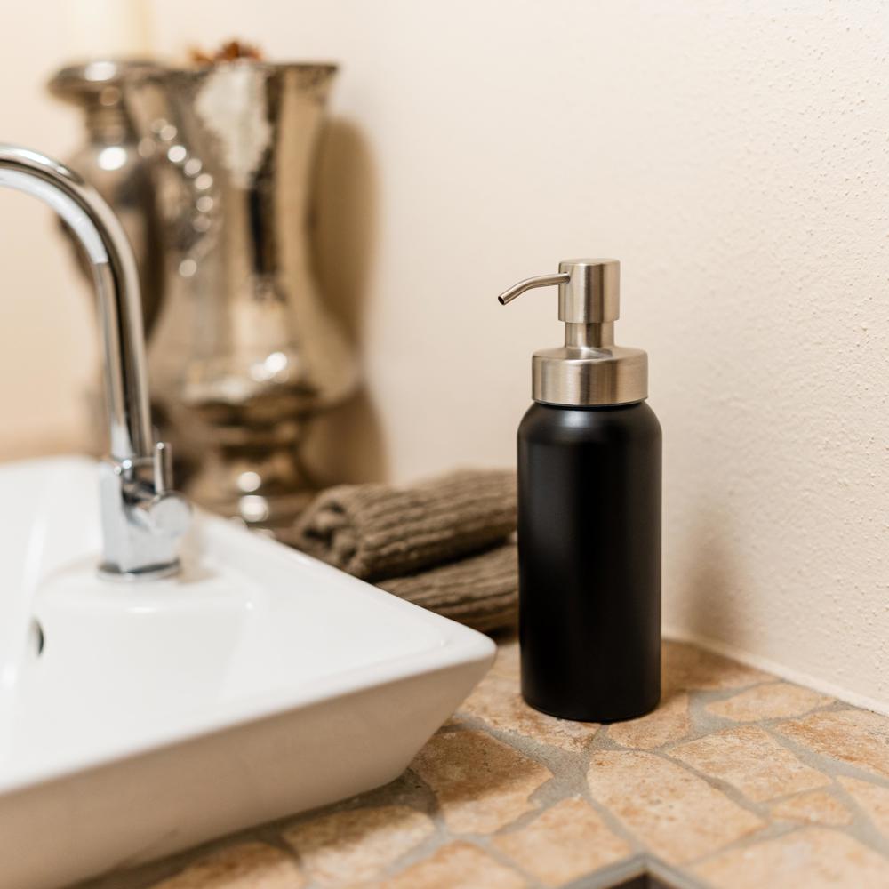 Hochwertiger Seifenspender mit einem Gefäß aus Aluminium und einem Spender aus Metall. Perfekte Dosierung, da durch leichten Druck auf den Dosierknopf die gewünschte Menge Seife bzw. Lotion herausgepumpt werden kann. Nachfüllbar und wiederverwendbar, dank der großen Öffnung zum Befüllen. Füllmenge: 0,4 Liter.