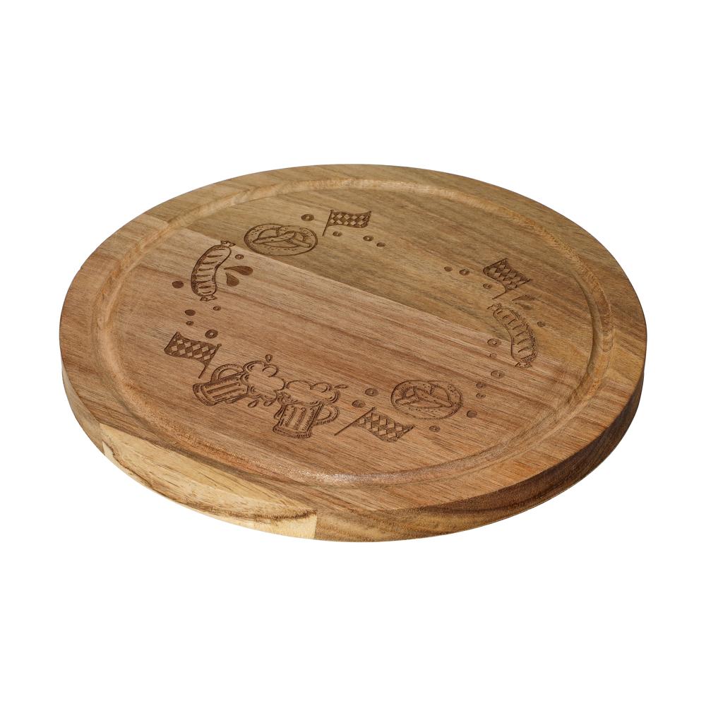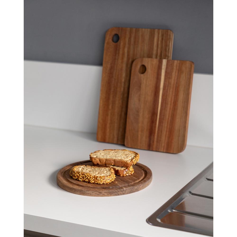 Das runde "Acacia" Schneidbrett (Ø 23 cm, 15 mm dick) aus Akazienholz verfügt über eine integrierte Saftrille. Seine Behandlung mit Sojabohnenöl schützt das Holz und erhält die Ästhetik. Ideal für tägliche Kücheneinsätze, empfiehlt sich die Handwäsche zur Pflege.