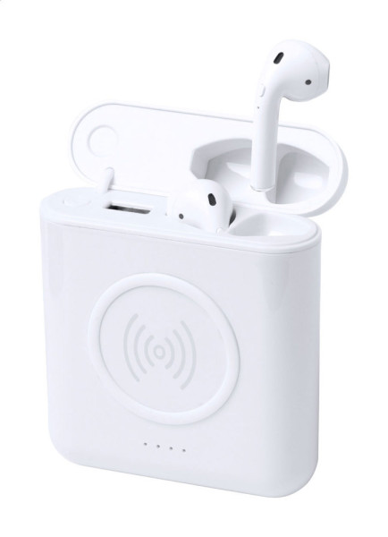 USB-Powerbank aus Kunststoff mit 5000-mAh-Akku, integriertem kabellosen Ladegerät (5 W) und True Wireless Stereo (TWS)-Ohrhörer mit Freisprechfunktion. USB-C-Eingangsanschluss. Inklusive USB-Ladekabel.