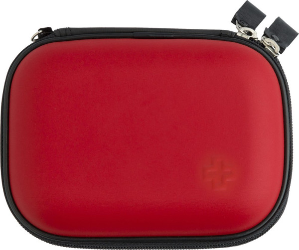 Notfall-Set im PU Etui, bestehend aus Bandage, Kompresse, 4 Desinfektionstüchern, Mullbinde, Schere, Kreppband, 2 Sicherheitsnadeln und 5 Pflastern. Nicht verkäuflich in der Schweiz. Dieses Produkt darf nur innerhalb der Europäischen Union verkauft und geliefert werden.