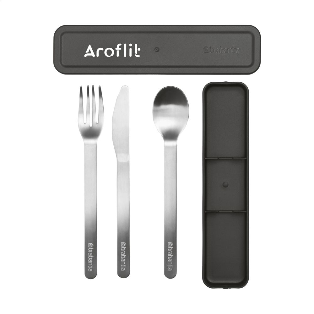 iederverwendbares Besteckset von Brabantia. Aus hochwertigem Edelstahl, bestehend aus Messer, Gabel und Löffel. Sicher und hygienisch verpackt in einer kompakten Kunststoffbox, ideal für unterwegs. Spülmaschinengeeignet. Um den Aufdruck zu erhalten, wird Waschen von Hand empfohlen. Hergestellt aus 25% recyceltem Material. 100% recycelbar. Mit 5 Jahren Herstellergarantie.