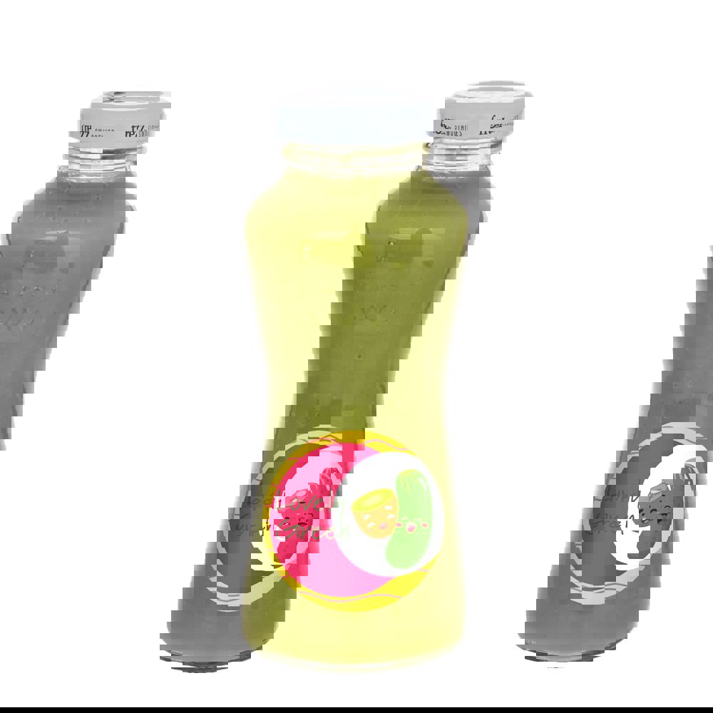 200 ml Smoothie Kiwi, Limette, Spinat und Gurke in Glasflasche mit weißem Verschluss. mehr