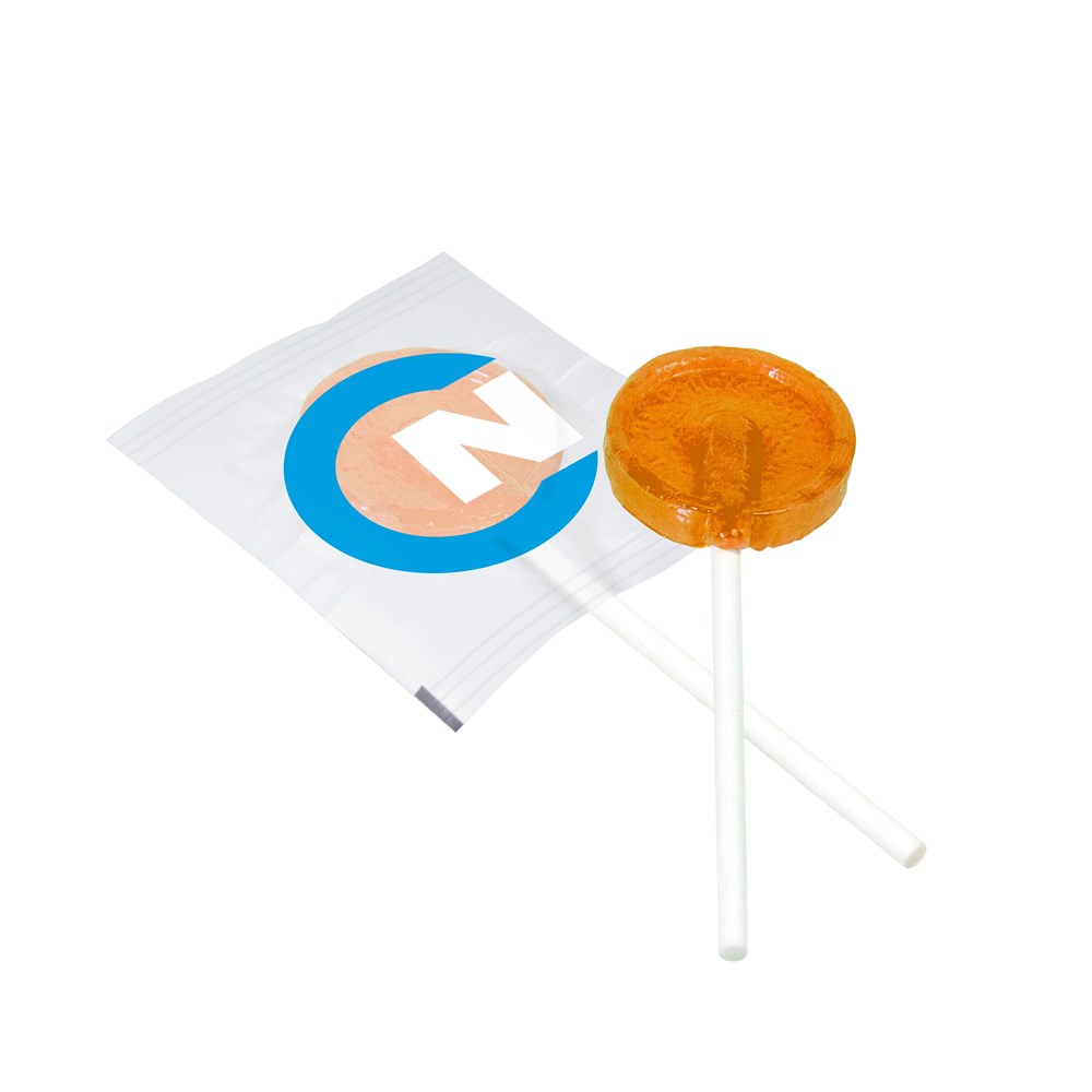 Flacher Lutscher von ca. 5,5 g, mit Mandarinengeschmack, in transparenter Folie, mit Allover-Druck auf der Vorderseite. Die Rückseite ist mehrfach bedruckt oder transparent