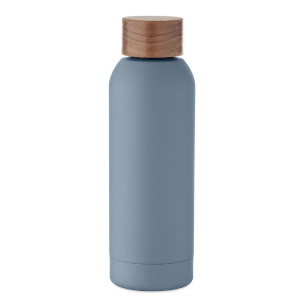 Einwandige Flasche aus recyceltem Edelstahl (90% recycelter Edelstahl und 10% Edelstahl). Gummiertes Finish und Verschluss aus Akazienholz-Finish. Auslaufsicher. Füllmenge: 700 ml. Da die einwandige Flasche die Hitze nach Außen leiten kann, kann der Artikel heiß werden.