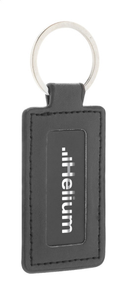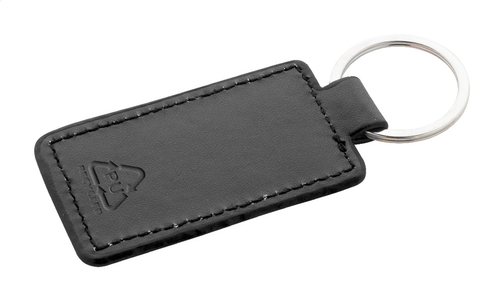 Rechteckiger Schlüsselanhänger aus recyceltem PU-Leder mit Metallring und Logoplatte aus Edelstahl mit gummierter Oberfläche. Mit Spezialbeschichtung für Spiegelgravur.