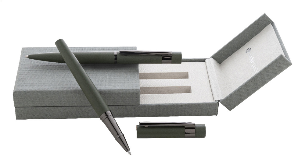 Elegantes Kugelschreiber- und Tintenroller-Set aus Metall mit glänzenden Gunmetal-Details, blauschreibend. In farblich abgestimmter Geschenkbox. Marke: André Philippe.
