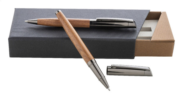 Elegantes Kugelschreiber- und Tintenroller-Set aus Metall mit Holzschaft und glänzenden Gunmetal-Details, blauschreibend. In zweifarbiger Geschenkbox. Marke: André Philippe.