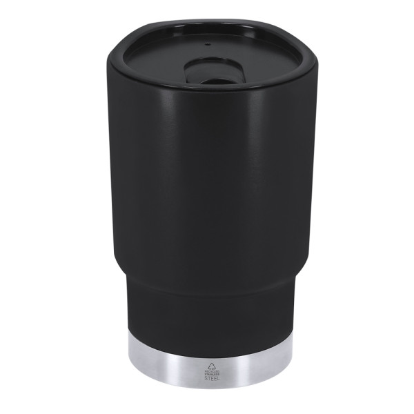 380 ml Thermobecher. Hergestellt aus widerstandsfähigem recyceltem PP mit Doppelwand, kombiniert mit einem Boden aus recyceltem Edelstahl. Deckel mit leicht zu öffnendem Dosierer, BPA-frei. Ideal für den Schreibtisch, den Tisch oder jede Oberfläche, um Ihr Lieblingsgetränk in Ruhe zu genießen. Mit Food-Grade-Zertifizierung, die Sicherheit im Kontakt mit Lebensmitteln garantiert. Mit Emblem aus recyceltem Edelstahl. Recyceltes PP ist ein recycelter und hochgradig wiederverwertbarer Kunststoff, sehr widerstandsfähig und für zahlreiche Anwendungen geeignet. Stahl ist eines der gefragtesten Materialien und findet sich fast überall, von Alltagsprodukten bis hin zu großen Bauwerken. Mit unzähligen Eigenschaften, insbesondere Haltbarkeit und hohem Wiederverwendungsgrad, ist er eine sehr geschätzte Alternative für nachhaltige Lösungen. Richtig behandelt, liefert er neue Ressourcen für unendliche Nutzung.