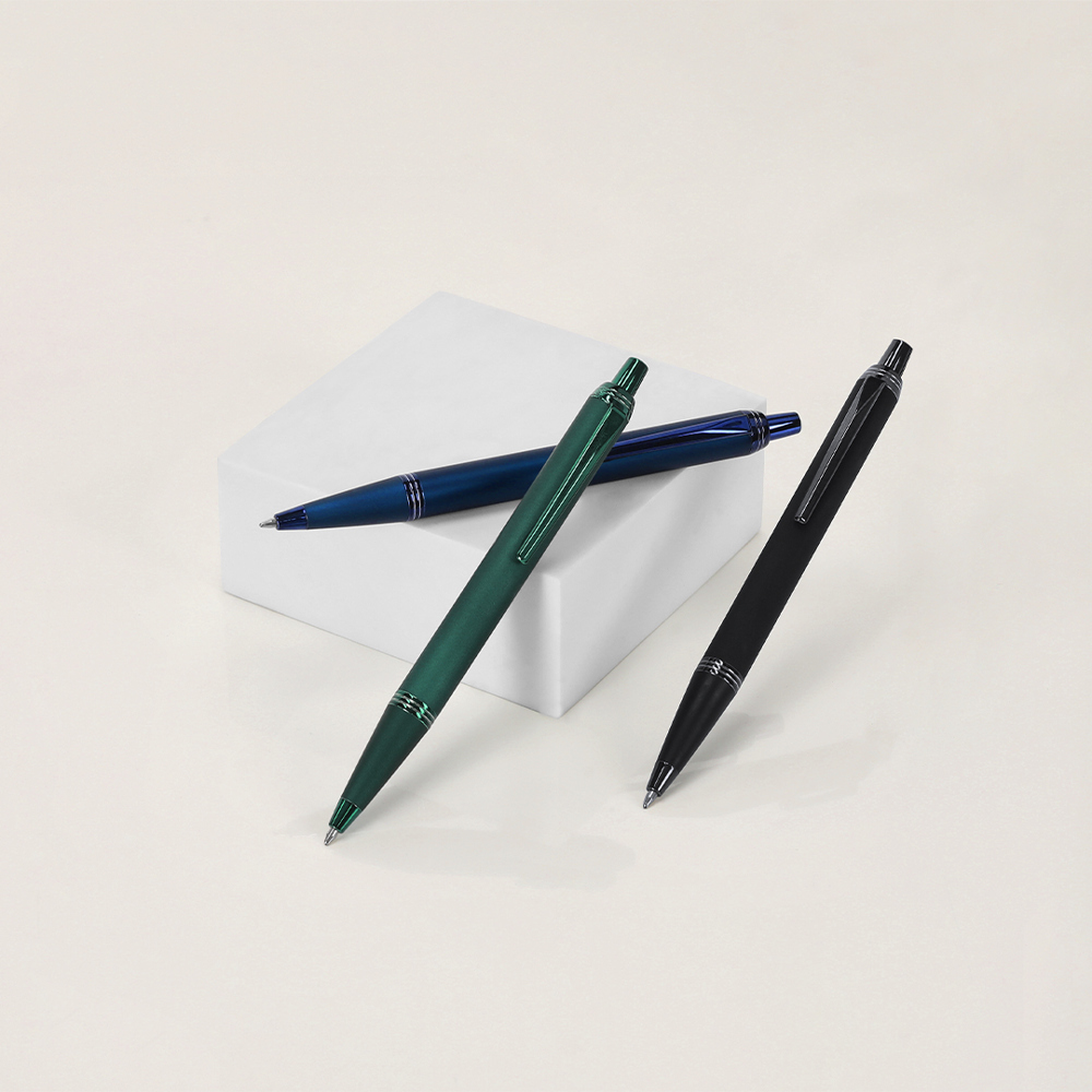 Kugelschreiber mit Aluminiumgehäuse, gummierter Oberfläche und Chromdetails. Druckmechanismus, Jumbo-Mine und blaue Tinte.