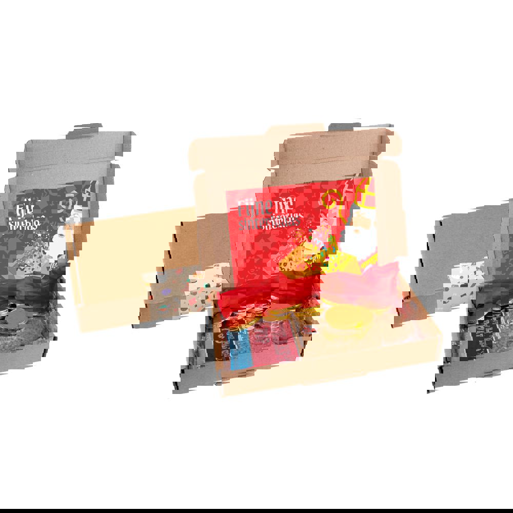 Brauner Versandkarton, gefüllt mit einem Spekulatius und ca. 50 Gramm Schokoladenmünzen. Ausgestattet mit einer doppelseitig bedruckten A6-Karte und verschlossen mit einem Standard "Sinterklaas" Aufkleber.